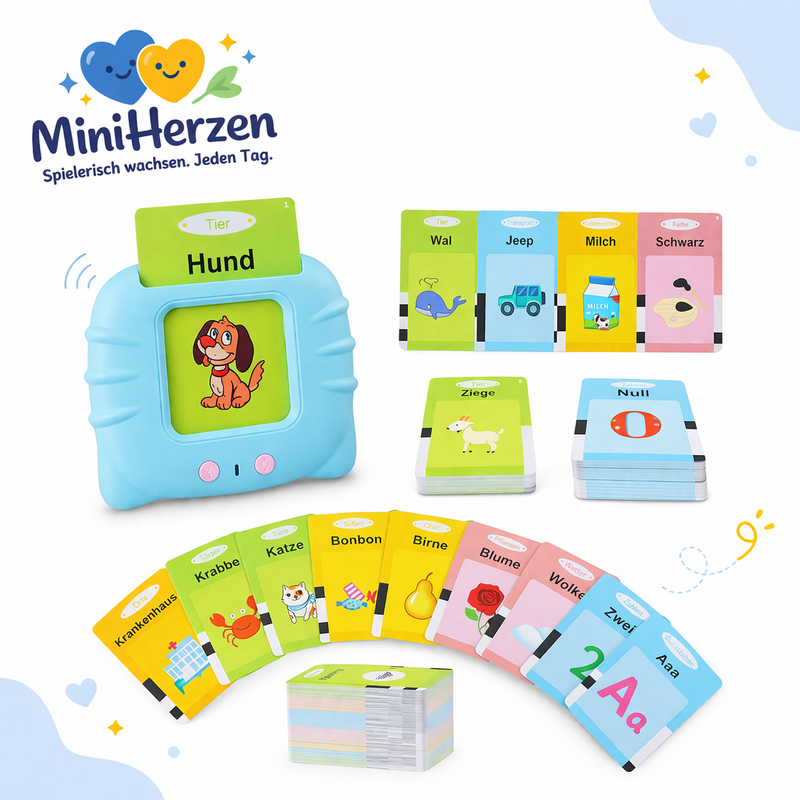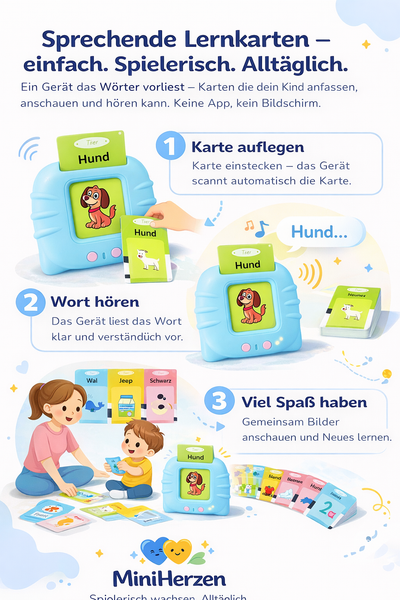 ▼Die sprechenden Lernkarten wurden entwickelt um Sprachmomente zu schaffen, spielerisch, druckfrei und alltagsnah. Es motiviert Kinder zum Sprechen durch Wiederholung, Klang und echte Alltagswörter. Es ist kein Medizinprodukt und kein Ersatz für logopädische Behandlung.